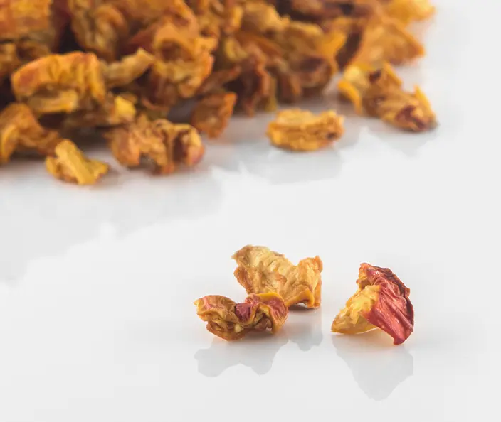 Der Cashewapfel zählt botanisch weder zu den Äpfeln noch zu den Früchten. Er ist ein verdickter Fruchtstiel, an dem der Cashewkern wächst. Was sich ungeniessbar anhört, ist in den Ursprungsländern eine beliebte Zwischenmahlzeit. Da frische Cashewäpfel rasch verderben, schneiden und trocknen die Mitarbeitenden von gebana Burkina Faso sie. Cashewäpfel haben einen hohen Taningehalt – das schmeckt man.