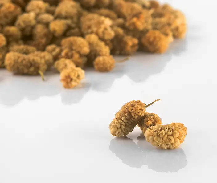 Frische Maulbeeren verderben sehr schnell und reifen am Baum in sehr unterschiedlichen Geschwindigkeiten. Das macht den Transport frischer Beeren schwierig. Deshalb bieten wir die Beeren getrocknet an. Auf diese Weise konserviert, verlieren die Früchte ihre Farbe, werden sehr fest und erinnern in ihrem Geschmack stark an Honig.