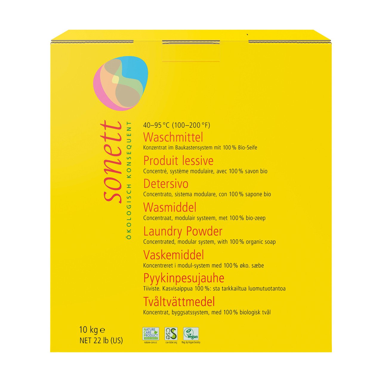 Baustein 1 im Sonett-Baukastensystem. Für alle Textilien aus Baumwolle, Leinen, Hanf und Mischgewebe. Das Sonett-Waschmittel enthält als Hauptwirkstoff reine Bio-Pflanzenölseife. Seife ist die der Natur und dem Menschen am nächsten liegende Waschsubstanz. Sie hat gegenüber allen anderen Tensiden die Fähigkeit, sich unmittelbar nach dem Gebrauch durch die Verbindung mit dem stets im Abwasser vorhandenen Kalk selbst zu entsorgen und wird danach leicht und vollständig abgebaut. Ohne Erdöltenside, ohne Enzyme (Gentechnik), duftfrei und vegan. Anwendung Ab mittlerer Wasserhärte, 14° französische Härte (df), zusätzlich Sonett Enthärter benutzen. Besonderheiten Das Baukastensystem mit seiner separaten Dosierung der drei Hauptbestandteile eines Waschmittels – waschaktive Substanzen, Enthärter und Bleichmittel – ermöglicht eine optimale Nutzung der einzelnen Stoffe entsprechend dem Verschmutzungsgrad der Kleidung, der Härte des Wassers und dem ganz individuellen Bedürfnis nach dem Weissgrad der Wäsche.